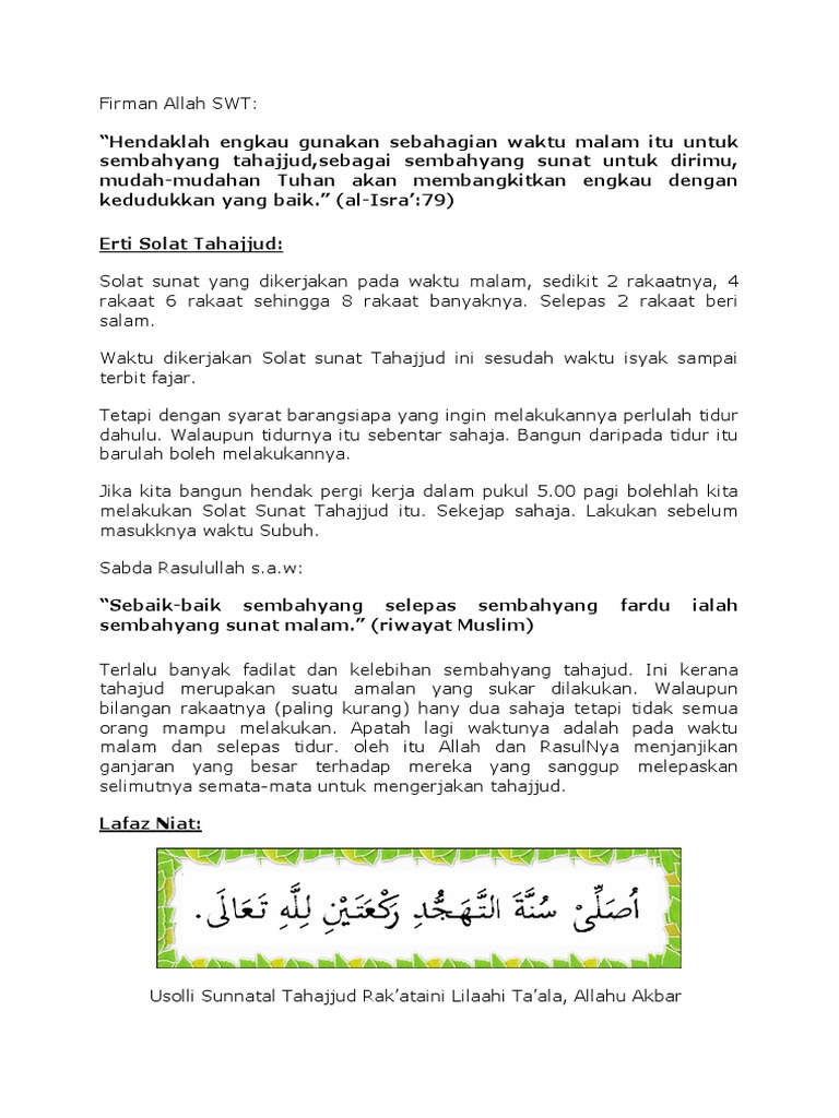 Ustazah Wa Solat Sunat Tahajjud Secara Ringkas Tahajjud Ialah Sembahyang Sunat Apabila Terjaga Daripada Tidur Malam Walaupun Tidur Hanya Sebentar Sembahyang Ini Dilakukan Selepas Daripada Waktu Isyak Sehingga Terbit Fajar Sebaik Baiknya