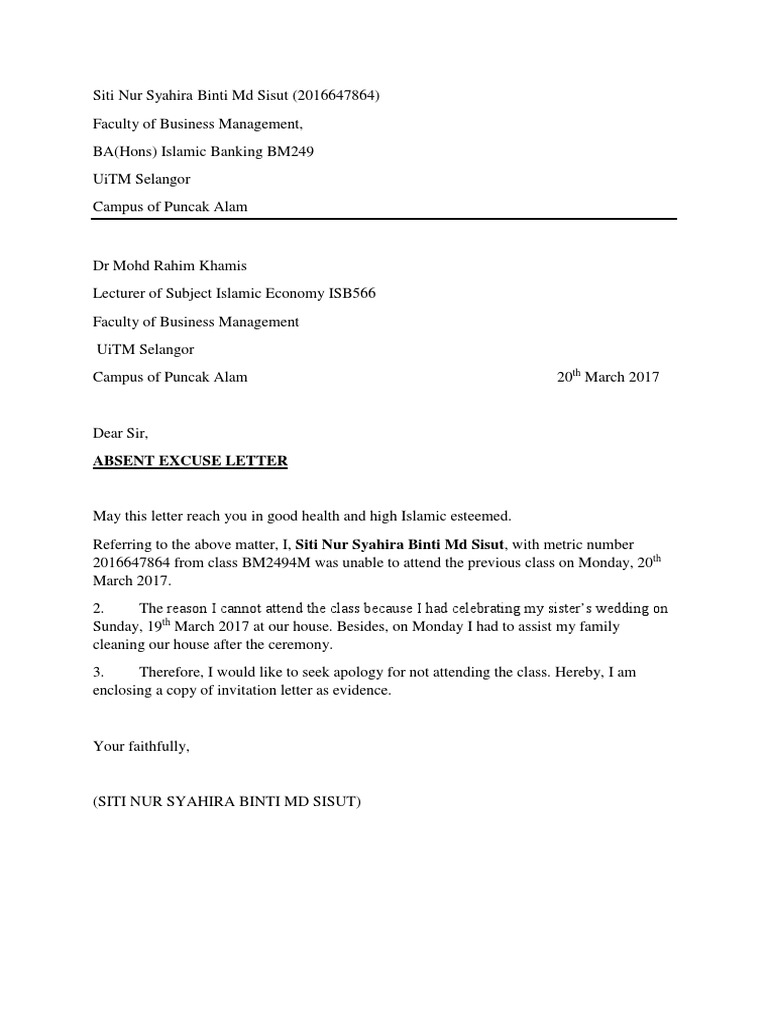 Dear student I am writing this letter on behalf of our honorable principal who personally looks after all the matters directly or indirectly related to. If you are unable to attend class due to work where is a sample template you can use to write an excuse letter for not attending class due to work. Referring to the above matter I Aishah binti Abd Rahim with metric number 0910738 from.