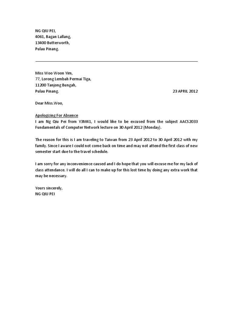 . Apology letter for not attending my class Respected sirmadam I would like to apologize to you for not attending my class yesterday without any prior notification to you actually I was. May this letter reach you in good health and high Islamic esteemed. MrMrs _______ name Im sorry to inform you of my absence from class.